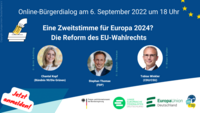 Bekommen alle EU-Bürgerinnen und -Bürger eine zweite Stimme bei der Europawahl 2024? Schalten Sie sich ein am 6. September und diskutieren Sie mit Chantal Kopf (Bündnis 90/Die Grünen), Stephan Thomae…