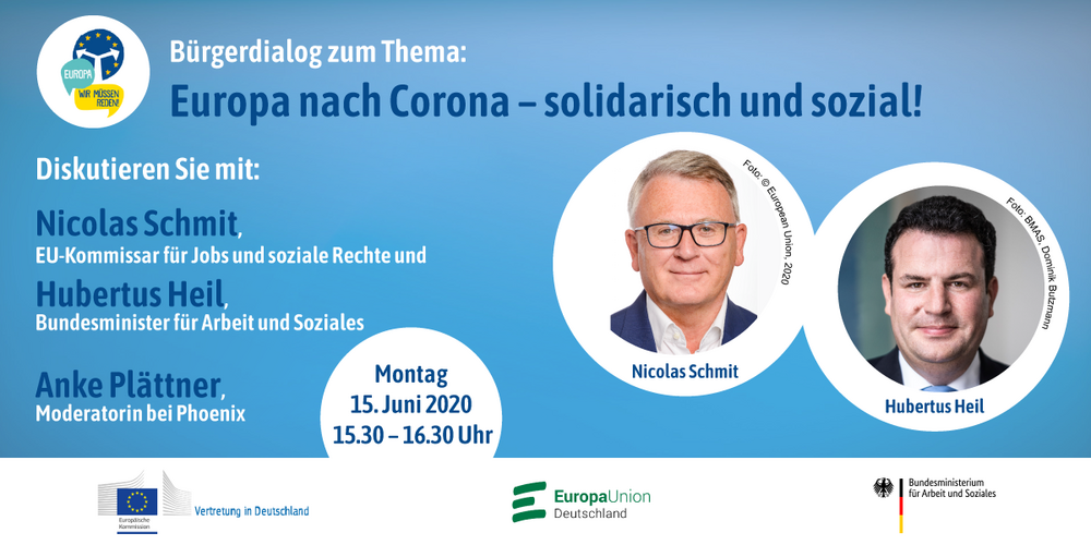 Wir möchten Sie herzlich zum Online-Bürgerdialog zu dem Thema "Europa nach Corona - solidarisch und sozial!" am Montag, 15. Juni 2020 von 15.30 - 16.30 Uhr einladen.