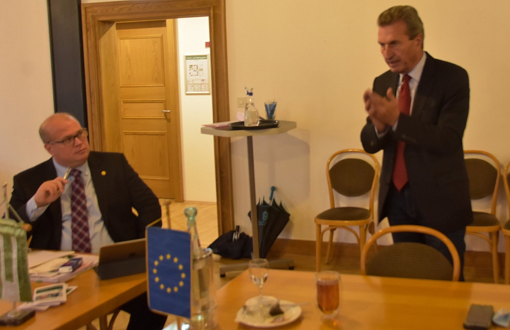 Günther Oettinger verdeutlichte in seiner Rede die derzeitige gesellschaftliche politische und wirtschaftliche Situation in der sich die Menschen in Deutschland und Europa befänden. Er skizzierte eindrucksvoll die Entstehung und den bisherigen Weg Europas und zeigte sich überzeugt, dass im Wettbewerb der sehr verschiedene Werteordnungen nur ein geeintes und starkes Europa eine Chance habe, zu bestehen.In der Zeit von 2010 bis 2014 hat Oettinger den Bereich Energie, von 2014 bis 2016 Digital Wirtschaft und Gesellschaft sowie bis 2019 Haushalt und Personal verantwortet. Für die Zukunft müsse Europa stärker und selbstbewusster werden und mit einer Stimmer sprechen, formulierte der ehem. EU-Kommissar. Europa müsse seine geopolitische Rolle definieren. Deshalb forderte Oettinger Europa auf, den Ehrgeiz zu haben, das 21. Jahrhundert nicht dem Spannungsfeld zwischen USA und China zu überlassen, sondern sich für die Zukunft einzubringen. „Denn wir erleben derzeit einen Kampf der Systeme zwischen USA und Chirna. Wir müssen als Europäer unsere Wertordnung stärker und besser einbringen“ appelierte der Gast. 75 Jahre Frieden in Europa seien Grund dazu, sich wieter gemeinsam zu bemühen