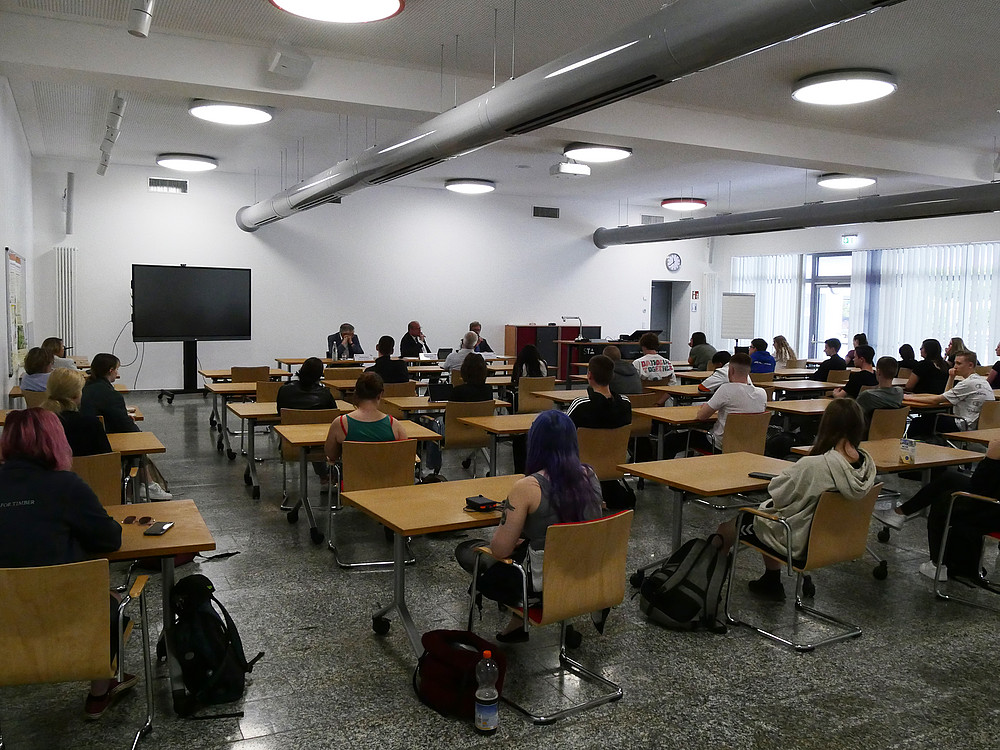 Die Max-Eyth-Schule, eine von 33 Europaschulen in Hessen, hatte das Thema Ukraine-Krieg in den Kursen des Faches Politik und Wirtschaft im Beruflichen Gymnasium eingehend vorbereitet. Entsprechend kritisch stellten die Schülerinnen und Schüler ihre Fragen an die Podiumseilnehmer. So fragte eine Schülerin, ob Waffenlieferungen den Krieg und das Leiden noch verlängern würden und in Wirklichkeit nur die Rüstungsindustrie davon profitiere. Dies wurde sowohl von Landrat Görig als auch von Thomas Mann mit Blick auf die diplomatische Einordnung der Politik Vladimir Putins verneint: „Jedem angegriffenen Land, steht das Recht auf Selbstverteidigung zu, es ist geradezu unsere Pflicht, solchen Ländern auch mit Waffenlieferungen zu helfen“, waren sich Mann und Görig einig. Der Landrat ergänzte: „Das geht natürlich nur in Absprache mit unseren Verbündeten. Gleichzeitig muss die eigene Verteidigungsfähigkeit gewährleistet sein.“