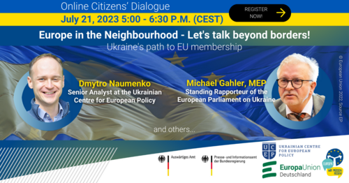 Diskutieren Sie gemeinsam bei unserem zweiten Online-Bürgerdialog unserer neuen Reihe "Europa in der Nachbarschaft - Wie müssen reden" am 21. Juli 2023 von 17:00 bis 18:30 Uhr zum Thema "Europe in the Neighbourhood - Let's talk beyond borders! Ukraine's path to EU membership". Treten Sie in den Dialog unter anderem mit Michael Gahler, Mitglied des Europäischen Parlaments und Ständiger Berichterstatter für die Ukraine und Dmytro Naumenko, Senior Analyst am Ukrainian Centre for European Policy.