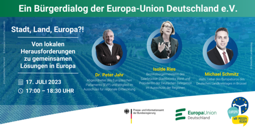 Diskutieren Sie am 17. Juli 2023 um 17 Uhr in unserem Online-Bürgerdialog mit Isolde Ries, Präsidentin der deutschen Delegation im Ausschuss der Regionen und Bezirksbürgermeisterin des Stadtbezirks Saarbrücken West, Dr. Peter Jahr (MdEP), Mitglied im Ausschuss für regionale Entwicklung des Europäischen Parlaments, sowie Michael Schmitz, stellvertretender Leiter des Europabüros des Deutschen Landkreistages in Brüssel, über die Bedeutung der Europäischen Union für unsere Regionen, Städte und Gemeinden.