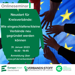 Am 31. Januar 2023 um 18:30 Uhr findet wieder die Verbands:stoff Online-Akademie von Europa-Union und JEF statt. Das Thema dieser ersten Ausgabe im neuen Jahr lautet „Neustart für Kreisverbände: Wie eingeschlafene/kleine Verbände neu gegründet werden können“. Dabei geht es auch darum, wie man vor Ort neue Mitglieder gewinnt.
