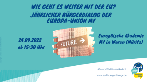 Die Europa-Union Mecklenburg-Vorpommern lädt in Kooperation mit der Europa-Union Deutschland zum jährlichen Bürgerdialog „Wie weiter mit der Europäischen Union“ am Sonnabend, den 24.09.2022, ab 15.30 Uhr in die Europäische Akademie Mecklenburg-Vorpommern in Waren (Müritz), Eldenholz 23, ein.