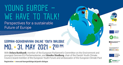 Seid am 31. Mai um 14 Uhr bei unserem Online-Jugenddialog „Young Europe – We have to talk! Perspectives for a sustainable Future of Europe” dabei und tauscht euch auf Englisch aus mit Delara Burkhardt, Mitglied im Umweltausschuss des Europäischen Parlaments und jüngste deutsche Europaabgeordnete, und Monika Skadborg, Vorsitzende des Dänischen Jugendklimarates und Botschafterin des Europäischen Klimapaktes.