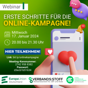 Die Europawahl rückt näher – Ehrenamtliche in ganz Deutschland stehen in den Startlöchern und bereiten Aktionen, Diskussionsveranstaltungen und weitere Aktivitäten vor. Zeit uns darüber auszutauschen! Am 24. Januar um 20 Uhr gibt es beim JEF-EUD verbands:stoff Webinar dazu Gelegenheit. EUD und JEF stellen Angebote, Materialien und Best Practices für Ehrenamtliche zur Europawahl-Kampagne EurHope vor.